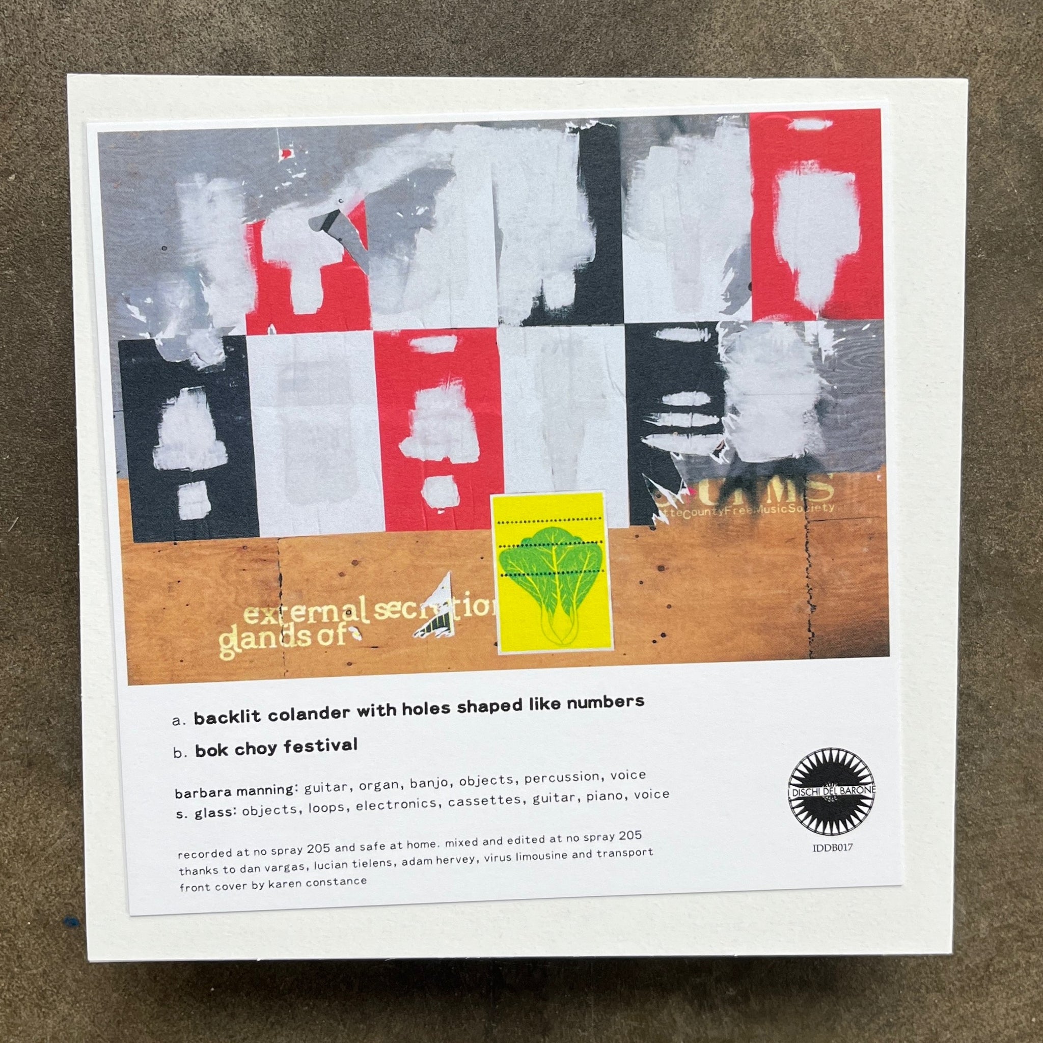 200 copies. Black vinyl, white cardboard sleeve with postcard attached, stamped white labels, insert. Plays at 33rpm. Two six-minute montages of reversed mitosis episodes, in which scaly pods, ruptured eggs, and clumps of partially digested hair smush through one another and glom together in unstable strains of S-Glass-spanktified dad-noise. 'Backlit Colander With Holes Shaped Like Numbers' crawls with bacteria from munched electronics, murmurs of a chimney-entrapped Frampton (plus camel, but that should go without saying), tape yoont teetering on the lip of a magnetic abyss, and piercing splats from tiny automatic paintball guns. “High” and “lonesome” are the operative descriptors of 'Bok Choy Festival': Barbara Manning’s guitar loops backfire and self-annihilate in private spritz-overdose orgies; avian-constructed effigies of Annie Hayworth curdle; narration on the topic of body dysmorphia is provided courtesy of thrift store cassettes and a Sister Rosetta Thorpe quotation. (Mint / New)