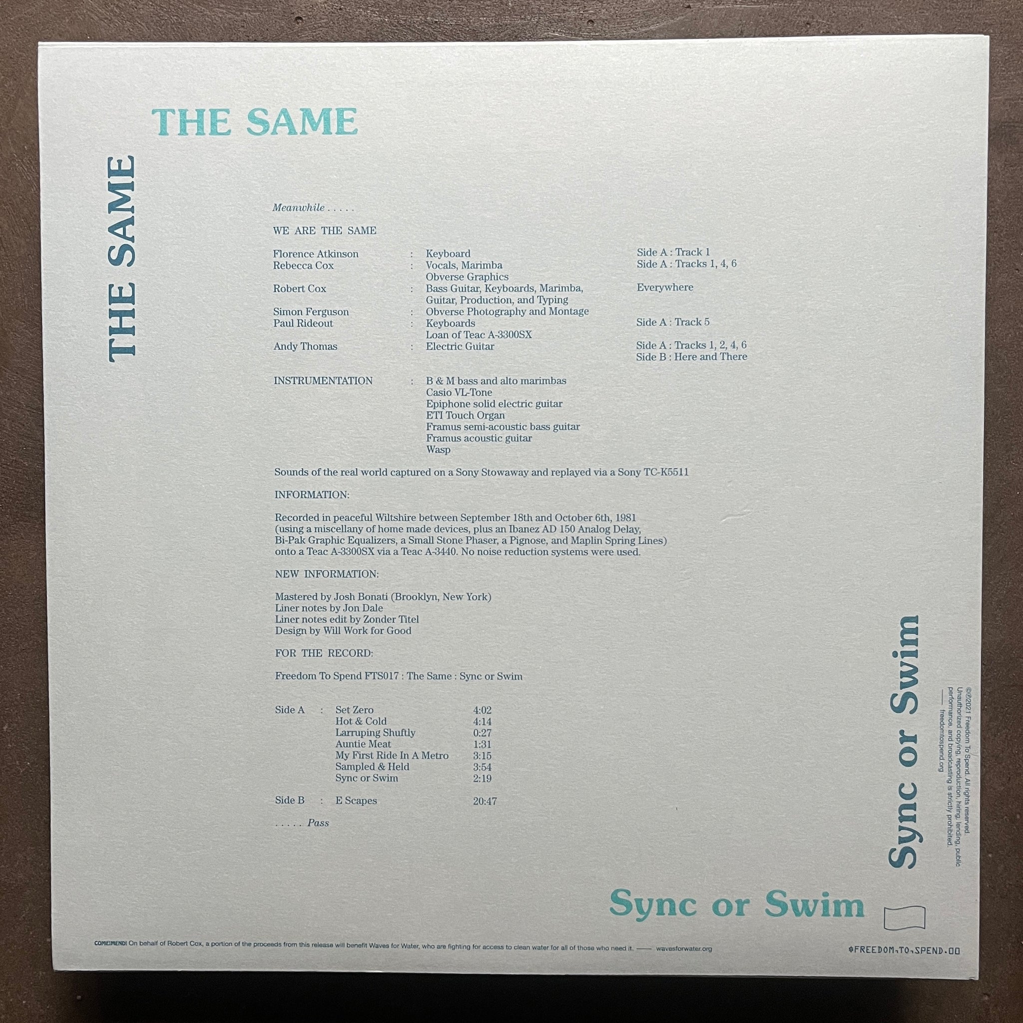 Incredible '84 masterstroke from Robert Cox (of Rimarimba fame) with 'Sync Or Swim' self-released via his own Unlikely Recordings imprint as The Same. Nestled by the English seaside in Suffolk, Cox was responsible for a number of releases (mainly through his Rimarimba guise) that crafted up a completely unique, complex yet playful, utterly enchanting sound-world through heavy use of repetition, prime-number sequencing and endless overdubbing, pursued with an unwavering DIY approach. Here follows a similar aesthetic, with percussive onslaughts and mind-boggling, rhythmic sequences enriched with shimmering guitar work that joins the dots between Robert Fripp and Manuel Gottsching. Yet nothing can prepare for the B-side epic 'E Scapes', a meandering 20+ minute sonic odyssey of deft sting interplay that beguiles and completely transcends my mere attempt to describe its brilliance with words. With the original LP near enough IMPOSSIBLE to obtain now, this humble, reasonably cassette represents the best route to owning a copy of this brilliance. Highest recommends!