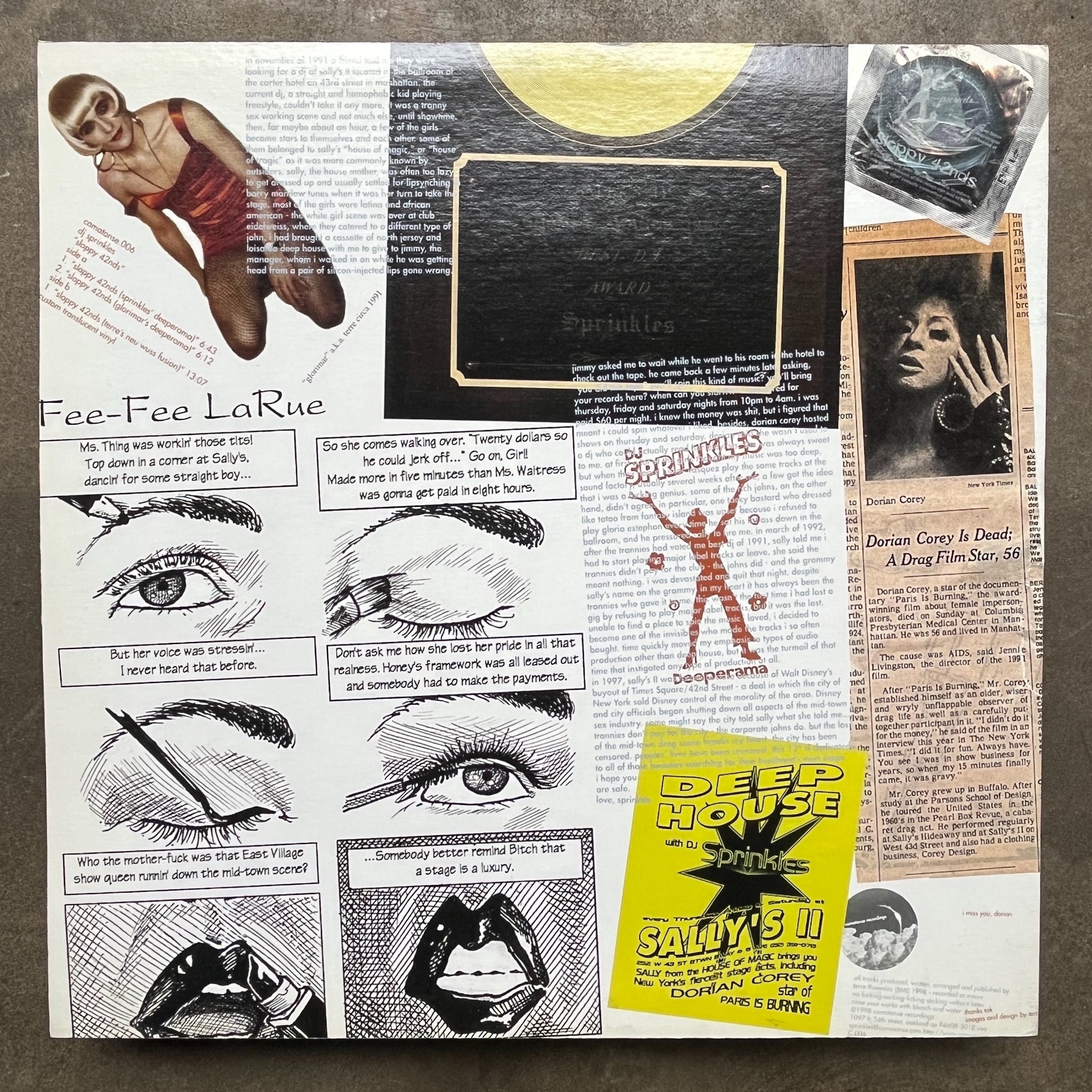 Terre Thaemlitz aka DJ Sprinkles self-released 12" via her holy Comatonse imprint in 1998, the EP laments the loss of the NYC mid-town drag scene with the full titled ‘A Tribute to the 42nd Street Transsexual Clubs Destroyed by Walt Disney's Buyout of Times Square’. Thaemlitz got a job as a resident DJ at legendary trans-club Sally’s II playing the same melancholic brand of deep house she’s known for today after submitting a tape to the club’s owner Jimmy, eventually going on to be award the coveted ‘Best DJ’ award in 1991 then finally sacked for not playing bullshit major label vocal house. This EP is a homage to those styles and sows the seed that would eventually lead to the faultless ‘Midtown 120 Blues’. A-side offers two variations of the title cut, it’s business as usual for Sprinkles fans.. deep, probing baselines, delayed-riddled muffled synth parts and huge clanging piano hits, whilst the ‘Terre’s Neu Wuss Fusion’ mix on the flip drifts off into chill-out room zones with the meandering flute motif and soft, rolling drum breaks.. BIG favourite, if it wasn’t already obvious.. (NM/NM)