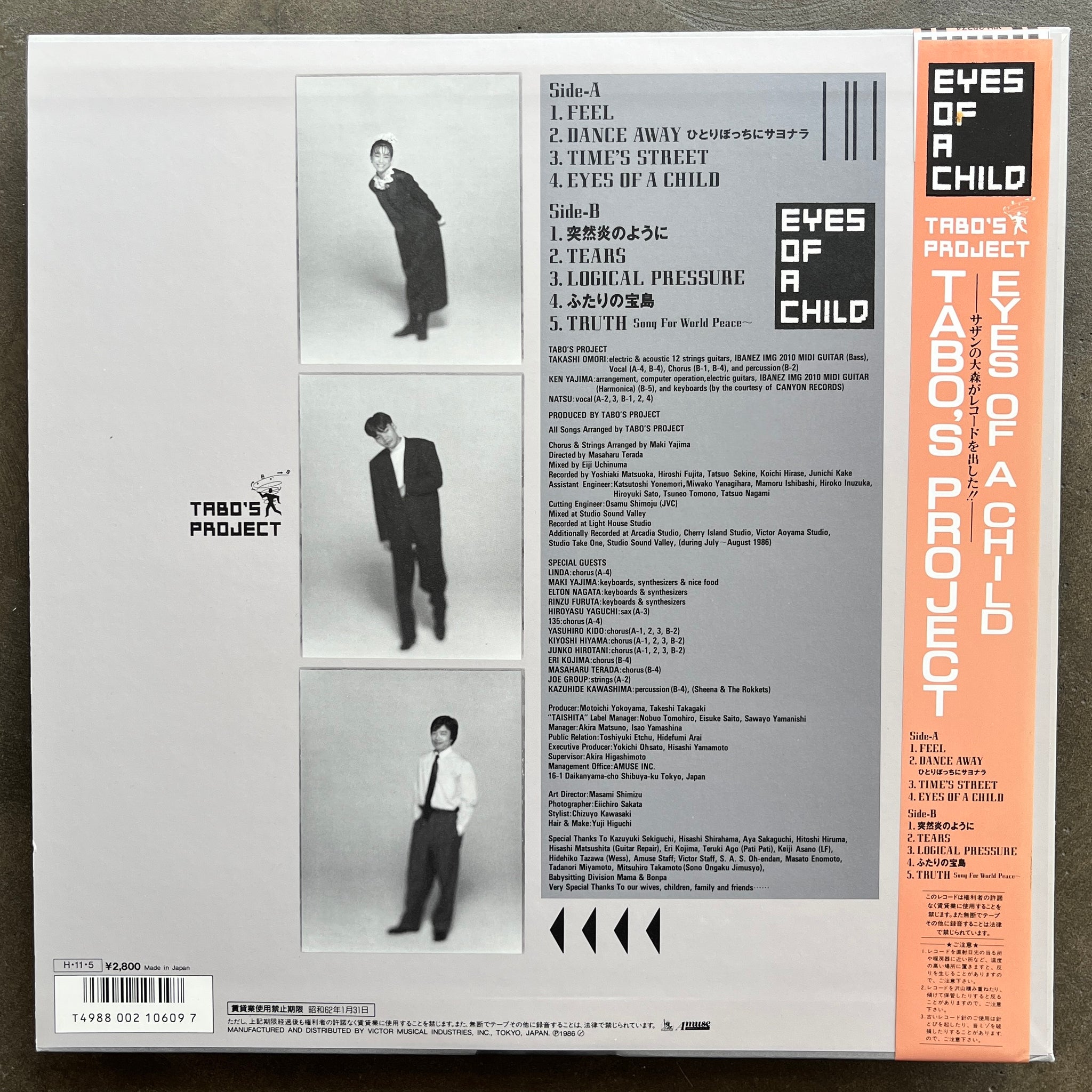 Lesser-spotted mid-80's Japanese synth-pop smash from Tabo's Project.. (NM.NM) Tracklist A1 Feel A2 Dance Away (ひとりぼっちにサヨナラ) A3 Time's Street A4 Eyes Of A Child B1 突然炎のように B2 Tears B3 Logical Pressure B4 ふたりの宝島 B5 Truth (Song For World Peace ~)