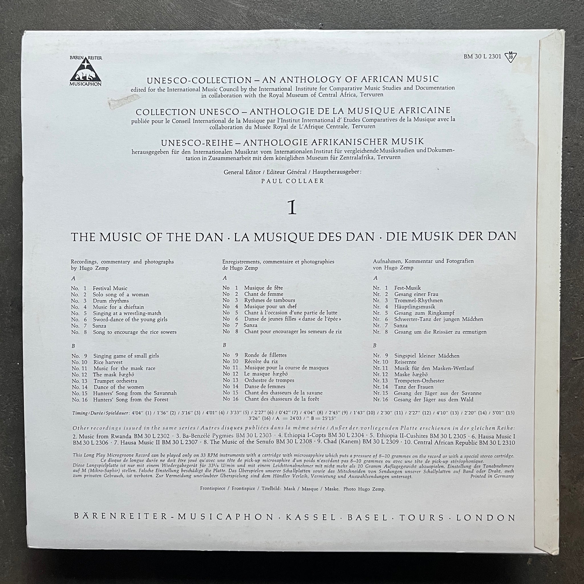 Tracklist A1 Festival Music 4:04 A2 Solo Song Of A Woman 1:56 A3 Drum Rhythms 3:16 A4 Music For A Chieftain 4:01 A5 Singing At A Wrestling Match 3:33 A6 Sword-dance Of The Young Girls 2:27 A7 Sanza 0:42 A8 Song To Encourage The Rice Sowers 4:04 B9 Singing Game Of Small Girls 2:45 B10 Rice Harvest 1:43 B11 Music For The Mask Race 2:30 B12 The Mask Bægbö 2:27 B13 Trumpet Orchestra 4:10 B14 Dance Of The Women 2:20 B15 Hunters' Song From The Savannah 5:01 B16 Hunters' Song Of The Forest 3:26