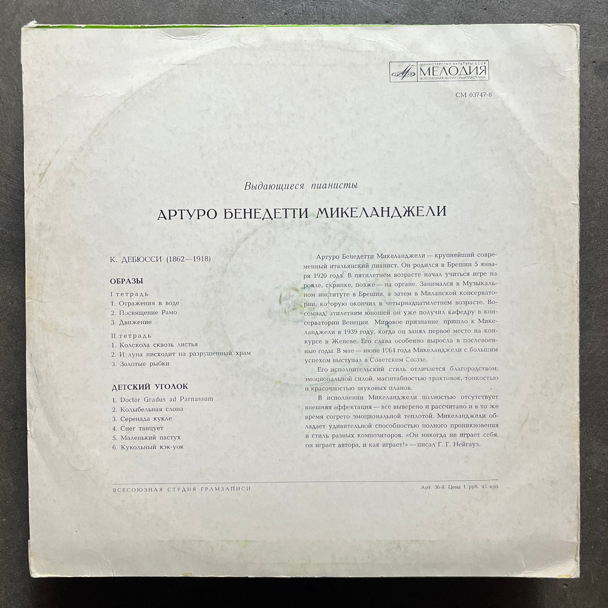 Timecapsule piano recordings of Italian pianist Arturo Benedetti Michelangi performing Debussy compositions released on Soviet state label Melodia.  (VG+)
