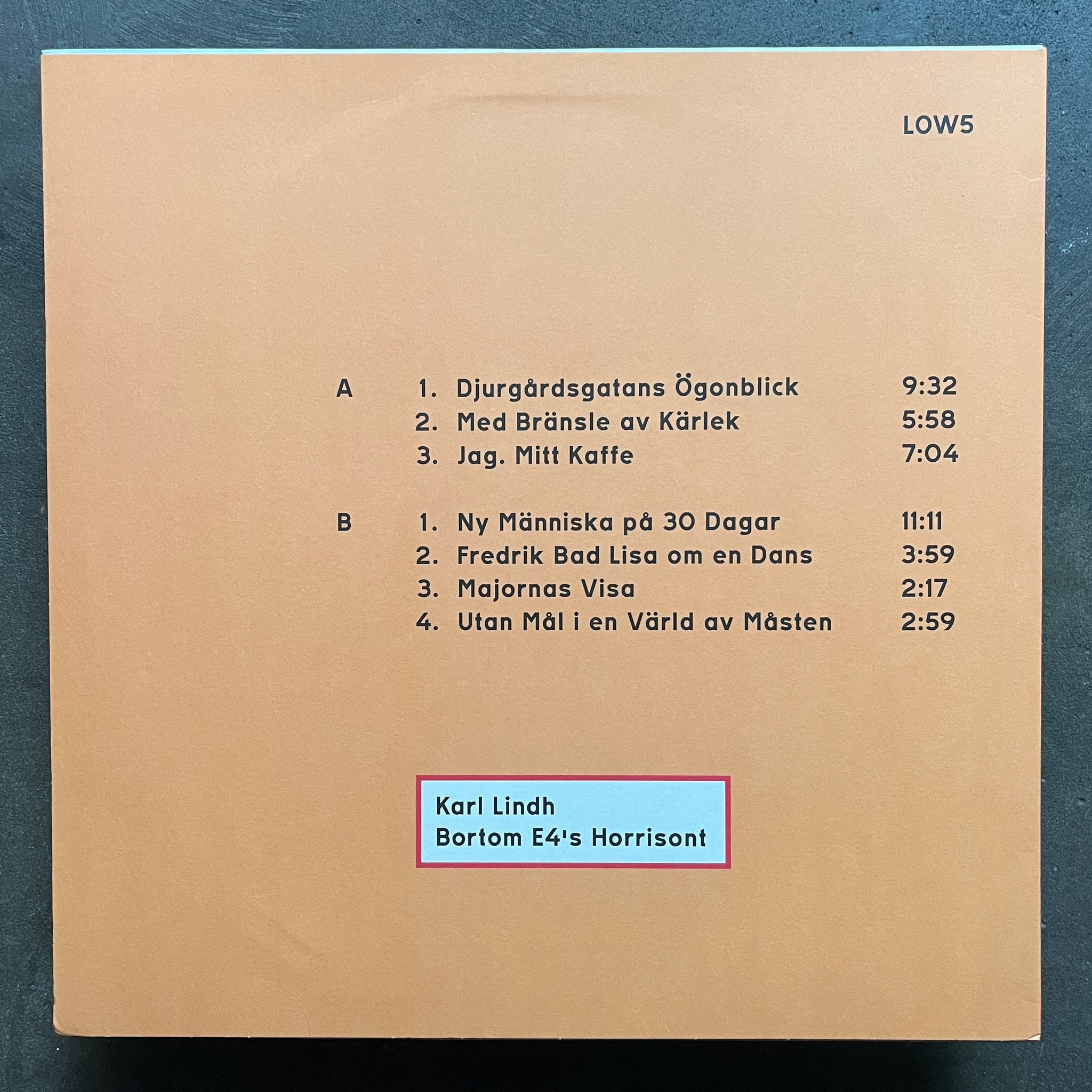 Tracklist A1 Djurgårdsgatans Ögonblick 9:32 A2 Med Bränsle Av Kärlek 5:58 A3 Jag. Mitt Kaffe 7:04 B1 Ny Människa På 30 Dagar 11:11 B2 Fredrik Bad Lisa Om En Dans 3:59 B3 Majornas Visa 2:17 B4 Utan Mål I En Värld Av Måsten 2:59