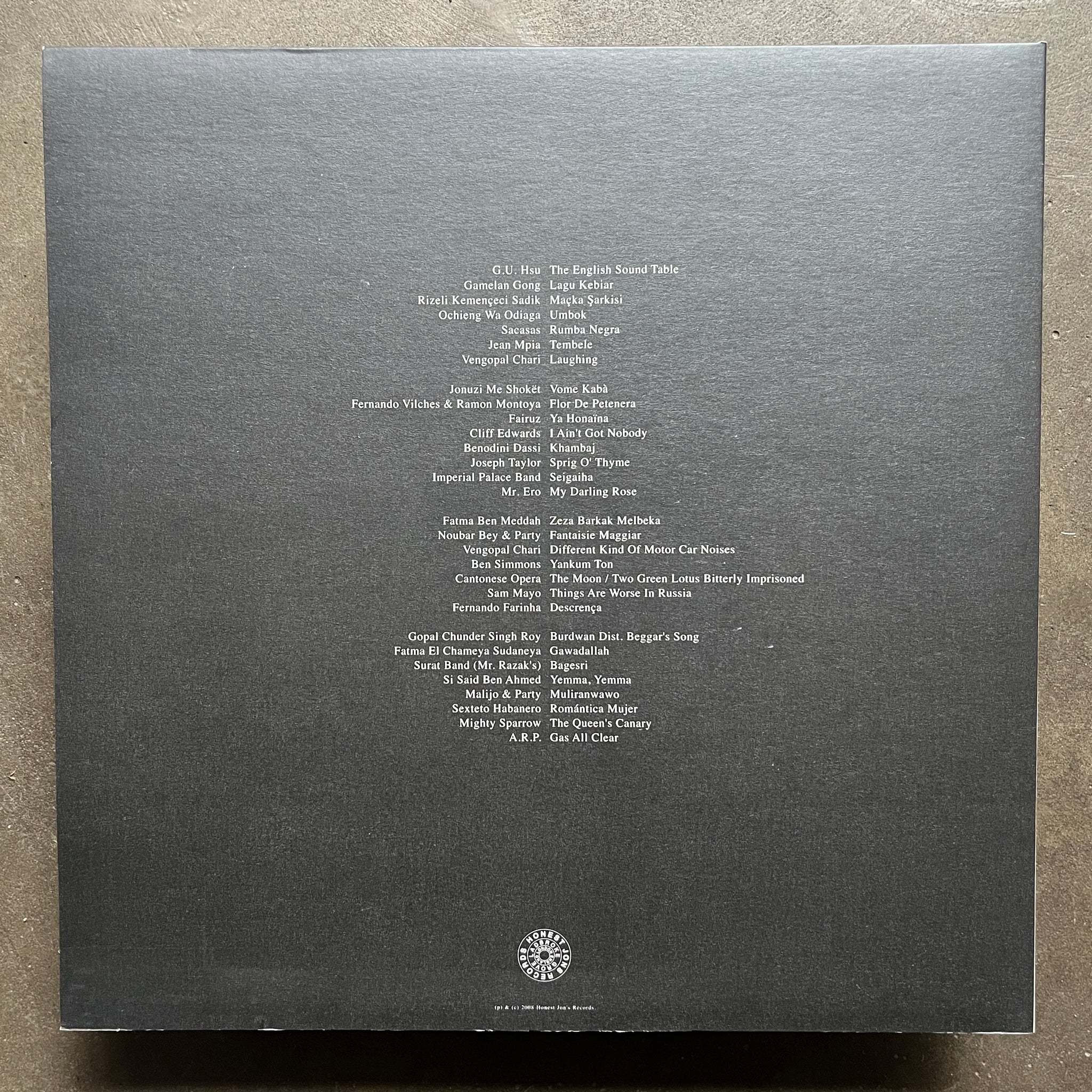 Tracklist A1 G.U. Hsu– The English Sound Table A2 Unknown Artist– Lagu Kebiar A3 Rizeli Kemençeci Sadik– Maçka Şarkisi A4 Ochieng Wa Odiaga– Umbok A5 Sacasas – Rumba Negra A6 Jean Mpia– Tembele A7 Vengopal Chari– Laughing B1 Jonuzi Me Shokët– Vome Kabà B2 Fernando Vilches & Ramon Montaya – Flor De Petenera B3 Fairuz– Ya Honaïna B4 Cliff Edwards – I Ain't Got Nobody B5 Benodini Dassi– Khambaj B6 Joseph Taylor– Sprig O' Thyme B7 Imperial Palace Band – Seigaiha B8 Mr. Ero– My Darling Rose C1 Fatma Ben Meddah– Zeza Barkak Melbeka C2 Noubar Bey & Party– Fantaisie Maggiar C3 Vengopal Chari– Different Kind Of Motor Car Noises C4 Ben Simmons – Yankum Ton C5 Unknown Artist– The Moon / Two Green Lotus Bitterly Imprisoned C6 Sam Mayo– Things Are Worse In Russia C7 Fernando Farinha– Descrença D1 Gopal Chunder Singh Roy– Burdwan Dist. Beggar's Song D2 Fatma El Chameya Sudaneya– Gawadallah D3 Surat Band (Mr. Razak's) – Bagesri D4 Si Said Ben Ahmed– Yemma, Yemma D5 Malijo & Party– Muliranwawo D6 Sexteto Habanero– Romántica Mujer D7 Mighty Sparrow– The Queen's Canary - Calypso D8 A.R.P. – Gas All Clear (Handbells)
