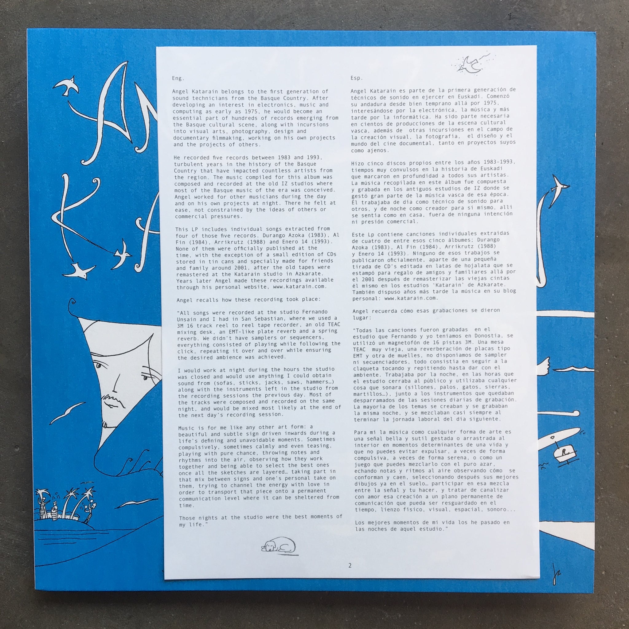 Having never officially released his own music, this compilation puts together a selection of works from four different albums that Angel previously made available digitally and in a very limited run of CDs distributed in tin cans for friends and family. Spanning his years as a studio engineer, Angel recorded these albums between 1983-1993 after working hours at Studios IZ in San Sebastian. As he states, his music was made with no commercial purposes, just for himself. It was only around 2001, after friends kept asking for it, that he decided to make his music available to the public. Remastered from the original tapes by Angel himself, it is now available for the first time on vinyl in a limited edition of 300 copies.