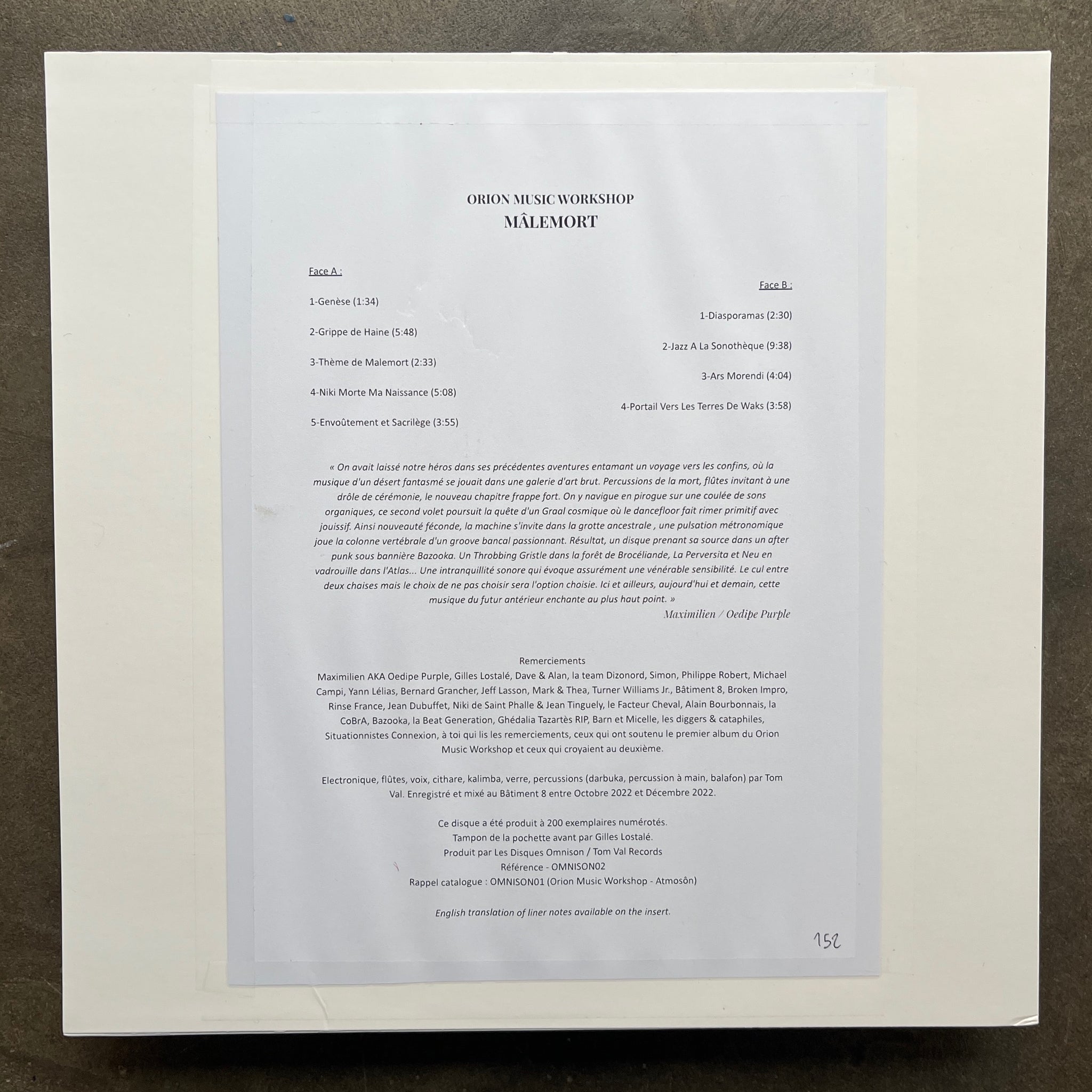 "Seemingly active since 2021, Orion Music Workshop has been steadily (and quietly) creating and manufacturing their own music on their own terms on the outskirts of Paris.It’s fringe music to the core - hermetic, inward-looking, claustrophobic and full of intrigue.We spend a lot of time looking for music with these qualities.The billowing flute skirts around the edges of free jazz, yet the metronomic 4/4 drive of the drum machine acts as a ground and structural core.It’s a combination that evokes Elliott Sharp and Bachir Attar’s incredible ‘In New York’ collaboration, but the textural and cultural sound-clash here evokes something more eerie and unsettling inside.Backwards tape loops, elliptical percussion and distant calls make for a deeply psychedelic, hyper-sensory experience - oddly ritualistic, cosmic and irresistible.The handy press references the anarchic spirit of La Peversita / Bazooka as inspiration, which is apt - we’ll happily throw in the likes of Leven Signs, Flaming Tunes and the Förlag För Fri Musik aesthetic (namely Oroskällan) for good measure.Real uncompromising outsider music.Edition of 200- individually hand made sleeves."