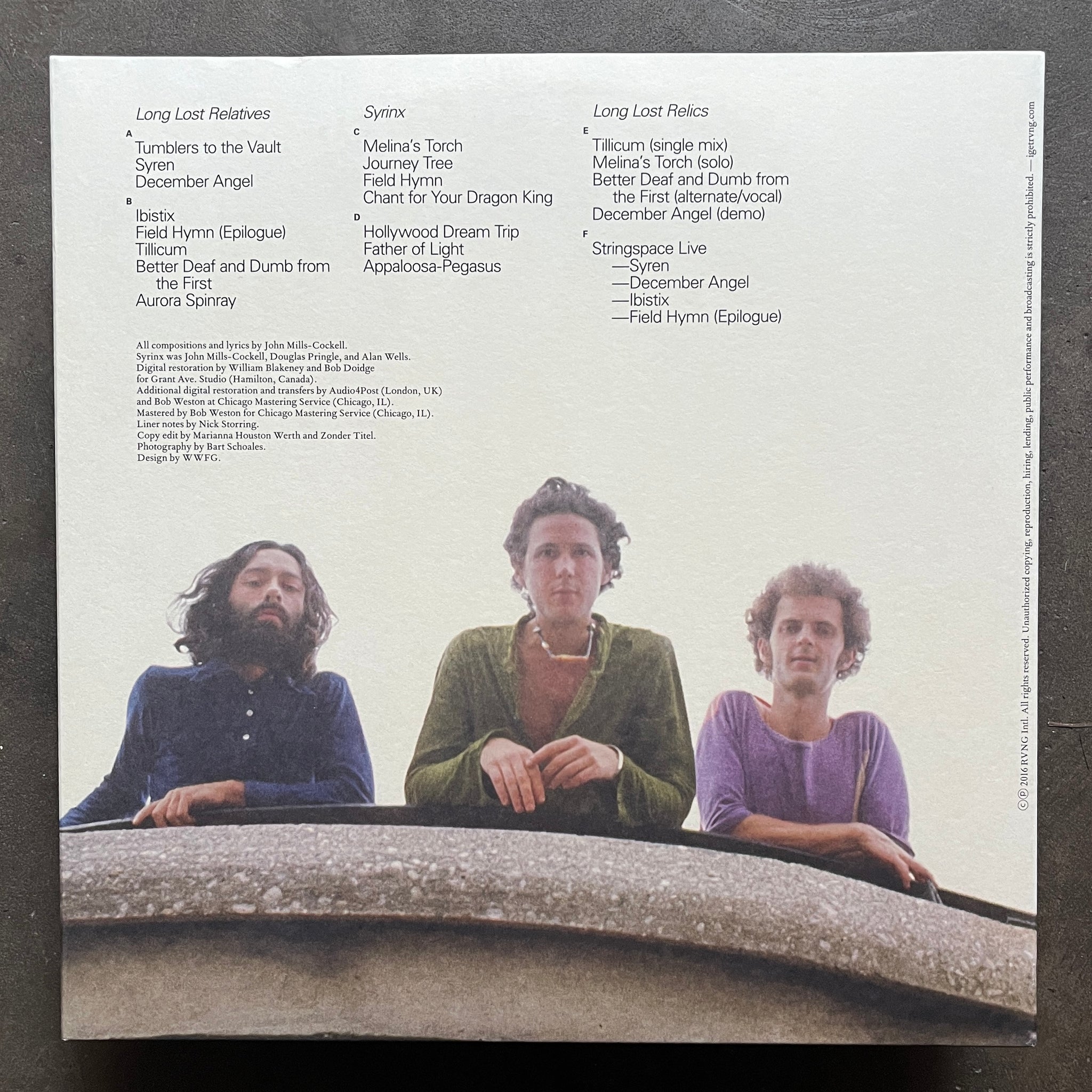 Tracklist Long Lost Relatives A1 Tumblers To The Vault 3:34 A2 Syren 6:09 A3 December Angel 8:57 B1 Ibistix 8:06 B2 Field Hymn (Epilogue) 2:54 B3 Tillicum 1:51 B4 Better Deaf And Dumb From The First 2:54 B5 Aurora Spinray 3:31 Syrinx C1 Melina's Torch 2:59 C2 Journey Tree 4:51 C3 Field Hymn 1:50 C4 Chant For Your Dragon King 10:25 D1 Hollywood Dream Trip 5:14 D2 Father Of Light 2:17 D3 Appaloosa-Pegasus 11:34 Long Lost Relics E1 Tillicum (Single Mix) 1:51 E2 Melina's Torch (Solo) 9:47 E3 Better Deaf And Dumb From The First (Alternate/Vocal) 3:42 E4 December Angel (Demo) 10:29 Stringspace Live F1 Syren 7:05 F2 December Angel 8:20 F3 Ibistix 7:56 F4 Field Hymn (Epilogue) 2:46