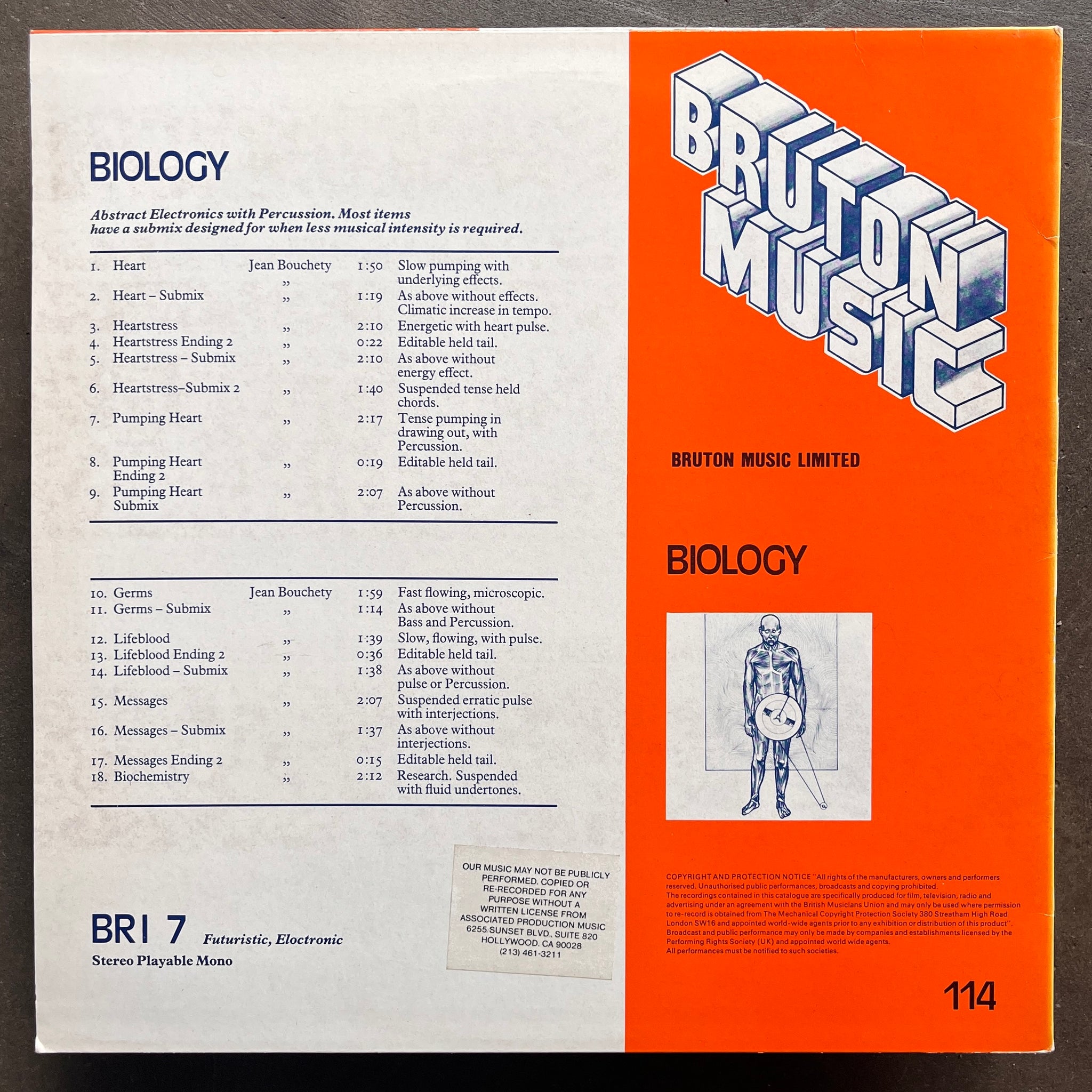 Rare and lesser-spotted electronic British library LP on Bruton. Odd electro passages with percussion and searching synths reflecting themes of THE HUMAN BODY. Great one. (Nm/VG+)
