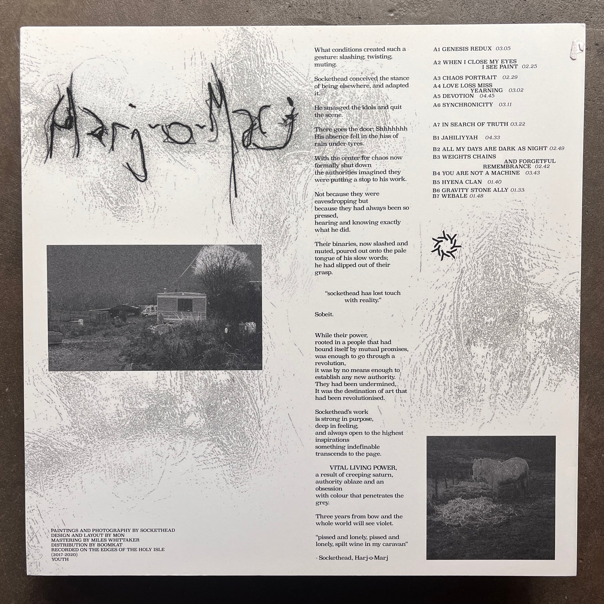 The prolific local Youth imprint taps back into Mcr’s prodigious Return To Zero production unit / NTS radio crew (w/ Fumu & Turinn) with a debut LP from local multi-talent Richard Harris aka Sockethead.Inspired by, concocted and executed during a stint of self-imposed isolation or better put, artistic residency, housed up in a lonely caravan on the West Coast of Scotland, Harris picks apart the mechanics of jungle, hardcore, Detroit, dub, chop’d ’n screwed and whatever else is available and rearranges into a rough-shod, DIY collage / smorgasbord that’s heavily indebted to staunchly independent spirit of our fine city and Rich’s own strong talents as a painter.It’s clear that the self-inflicted exile has fostered a more impulsive, creatively free-flowing nature throughout, recalling everyone from John Lafia’s 80s experiments for Trance Port, Muslimgauze’s sample-heavy approach, Graham Lambkin’s scruffed-up abstractions with The Shadow Ring or the recent drop from fellow Manc Tom Boogizm on Shotta tapes. The perfect blend of spontaneity and raw natural talent and another reason to be excited about this current crop of Manchester producers operating on their own frequency.. (NM)