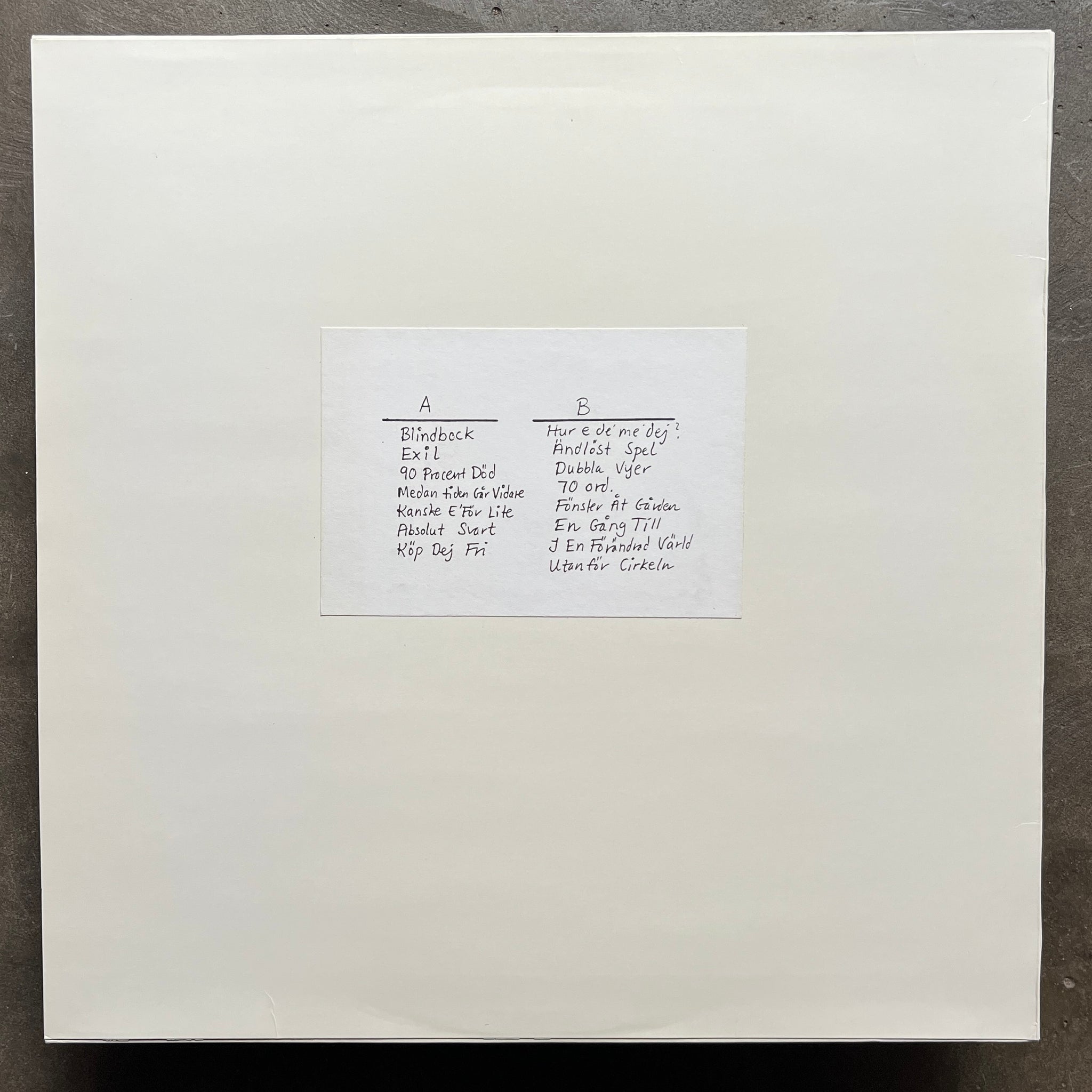 Tracklist A1 Blindbock A2 Exil A3 90 Procent Död A4 Medan Tiden Går Vidare A5 Kanske E'För Lite A6 Absolut Svart A7 Köp Dig Fri B1 Hur E' De' Me' Dej? B2 Ändlöst Spel B3 70 Ord B4 Fönster Åt Gården B5 En Gång Till B6 I En Förändrad Värld B7 Utanför Cirkeln