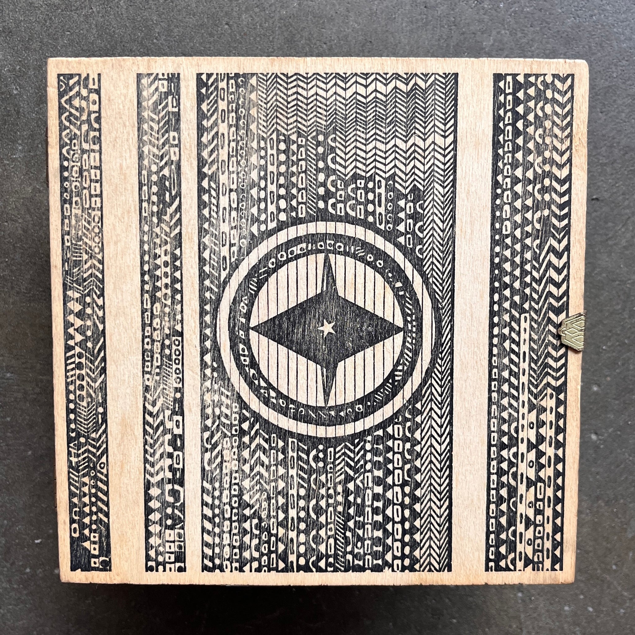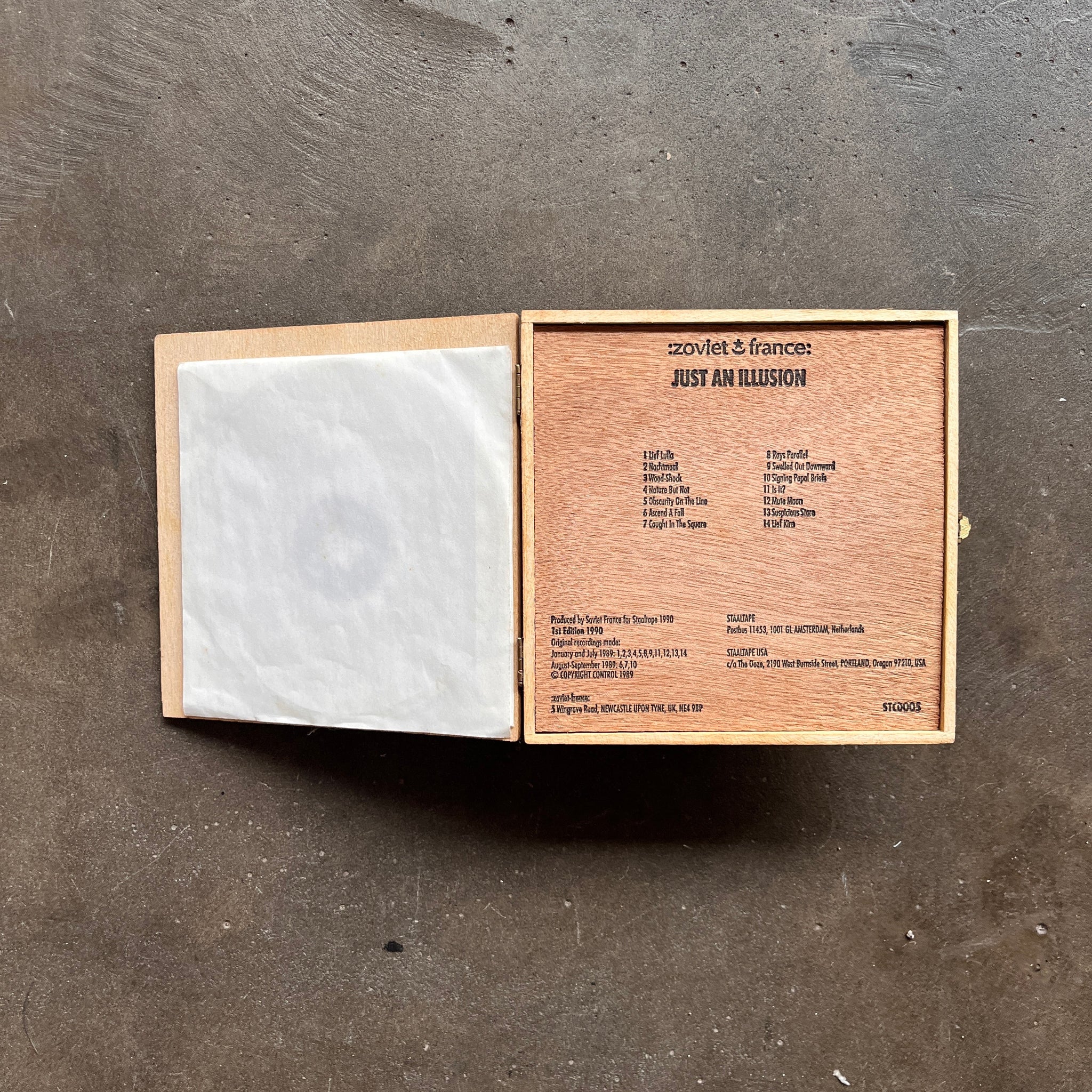 This is the first edition of the CD, in a plain white paper sleeve, packed in a screen printed hinged & clasped wooden box, with a 1mm wood veneer insert, (with release information printed on it), and a block of glued wood veneer cardboard layers. (NM)