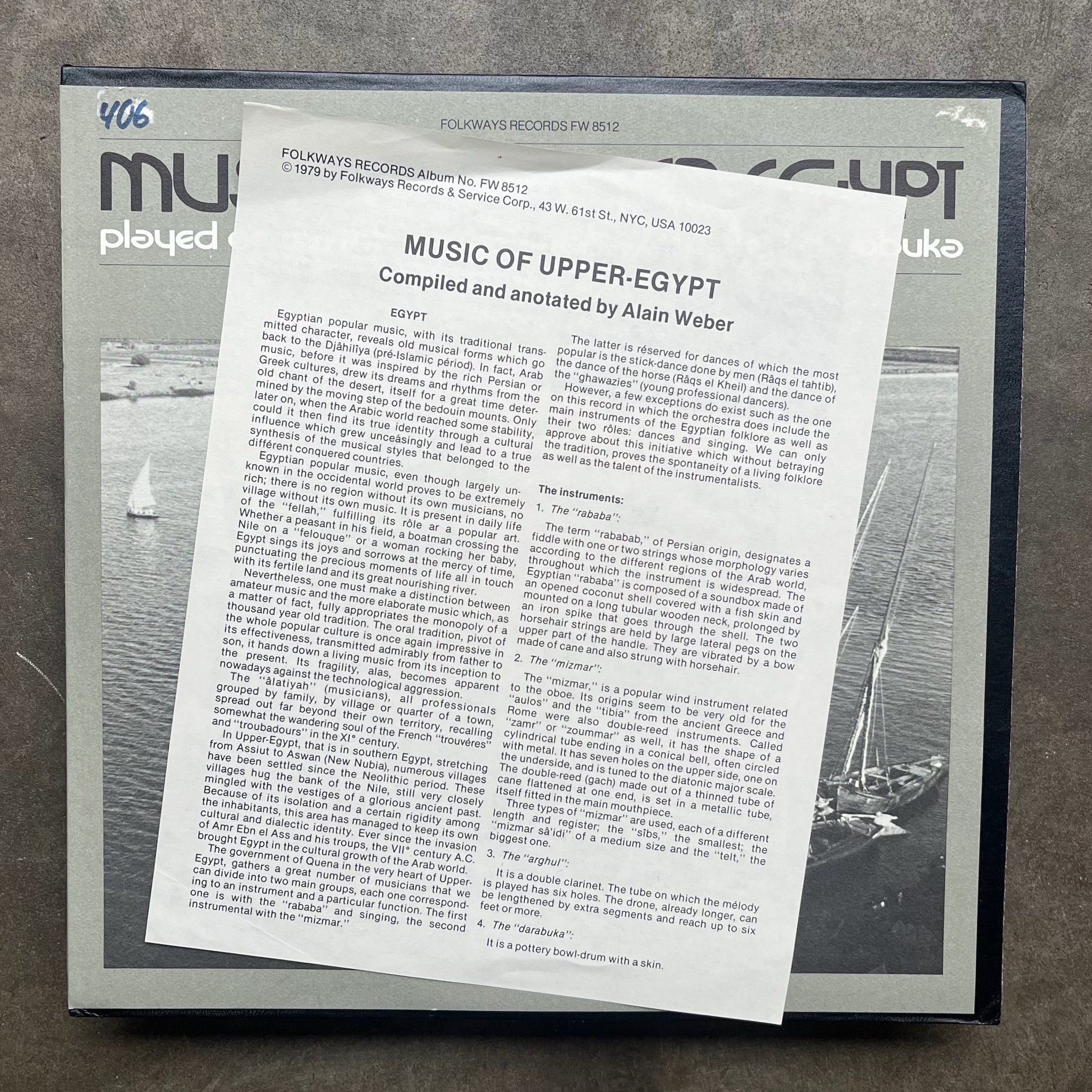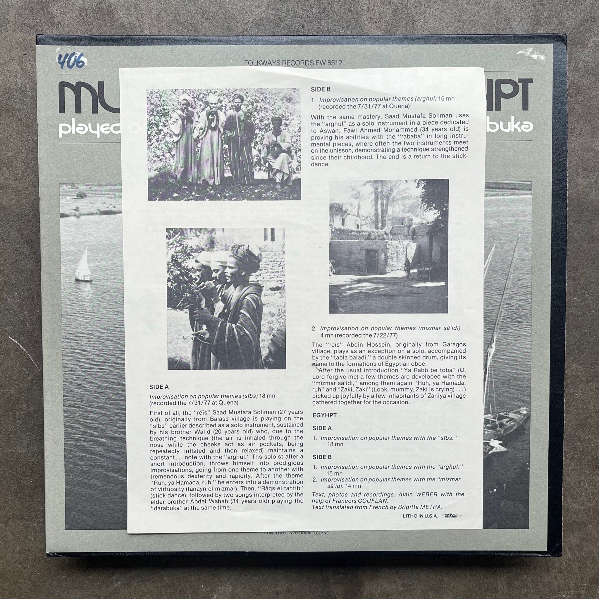Recorded in 1977, this field recording of improvisations on popular music is performed by musicians from Upper-Egypt, an area spanning mid-Egypt from Assiut to Aswan. The music features Egyptian instruments such as the rababa, a fiddle-like instrument with horsehair strings; the mizmar, a popular wind instrument related to the oboe; the arghul, a double clarinet; and the darabuka, a pottery bowl drum. The first two tracks feature the improvisations of Saad Mustafa Soliman, and the third track features Abdin Hossein as the reis or lead singer, accompanied by tabla baladi or double-skinned drum. Liner notes include brief information on Egyptian popular music, descriptions of the instruments, short biographies of the performers, and descriptions of the tracks.