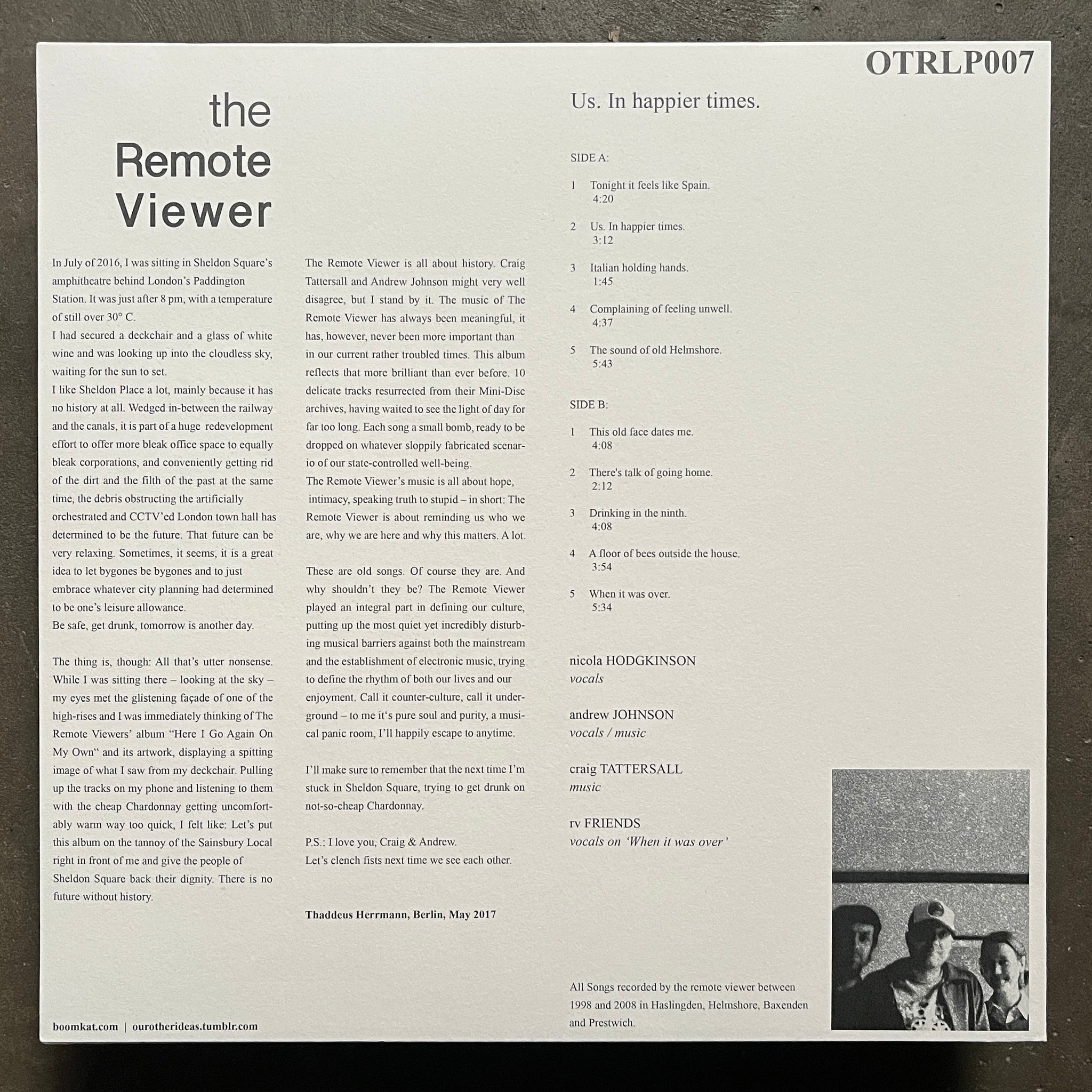 Craig Tattersall and Andrew Johnson raid the vaults for a collection of previously unreleased pieces from their much-loved yet still kinda over-looked The Remote Viewer project. In case ya didn't know, The Remote Viewer formed off the back of Leeds-based indie outfit Hood, which both Tattersall and Johnson were a part of, acting as a outpost for an truly original style of delicately constructed melancholic ambient-pop, produced with equal dollops of technically astute bedroom-electronica and a certain strain of Lancastrian miserablism that's entirely unique to the piss-wet moors and mill-towns of the North. In parts its twee as fuck, yet its done with the upmost sincerity and most minimal of means that the moods they create entirely genuine and intimate, yet the reference points aim towards usually more clinically inclined material from SND, Arovane, Phonem ++. Something that once you discover you'll keep coming back to. Very much a product of the North, so much so that it couldn't possibly come from anywhere else. Highest recommends.. (MINT / NEW).