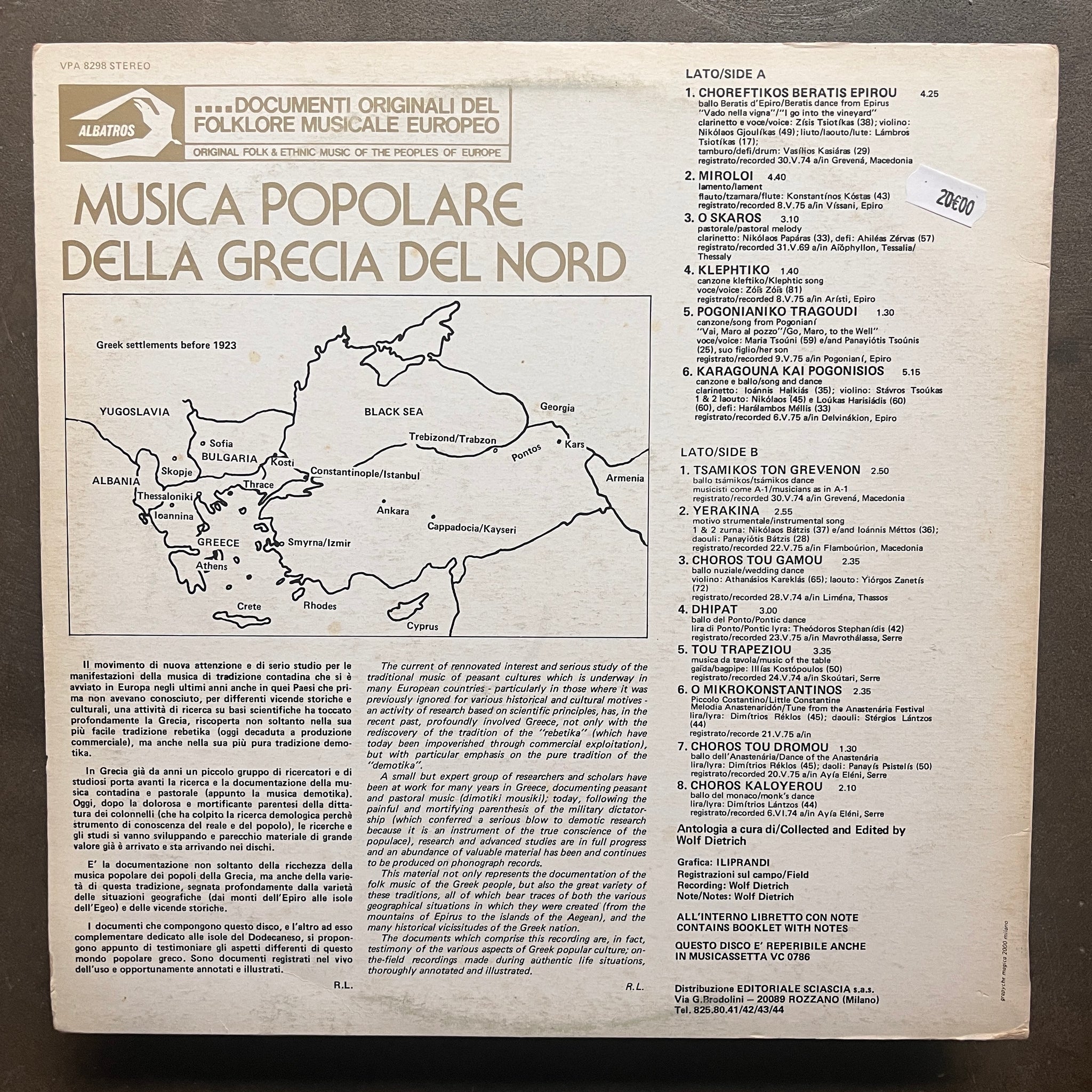 Tracklist A1 Choreftikos Beratis Epirou= Ballo Beratis D'Epiro = Beratis Dance From Epirus ("Vado Nella Vigna" = "I Go Into The Vineyard") 4:25 A2 Miroloi = Lamento = Lament 4:40 A3 O Skaros = Pastorale = Pastoral Melody 3:10 A4 Klephtiko = Canzone Kleftiko = Klephtic Song 1:40 A5 Pogonianiko Tragoudi = Canzone / Song From Pogoniani ("Vai, Maro Al Pozzo" = "Go, Maro To The Well") 1:30 A6 Karagouna Kai Pogonisios = Canzone E Ballo = Song And Dance 5:15 B1 Tsamikos Ton Grevenon = Ballo Tsamikos = Tsamikos Dance 2:50 B2 Yerakina = Motivo Strumentale = Instrumental Song 2:55 B3 Choros Tou Gamou = Ballo Nuziale = Wedding Dance 2:35 B4 Dhipat = Ballo Del Ponto = Pontic Dance 3:00 B5 Tuo Trapeziou = Musica Da Tavola = Music Of The Table 3:35 B6 O Mikrokonstantinos = Piccolo Constantino = Little Constantine (Melodia Anastenaridon = Tune From The Anastenaria Festival) 2:35 B7 Choros Tou Dromou = Ballo Dell' Anastenaria = Dance Of The Anastenaria 1:30 B8 Choros Kaloyerou = Ballo Del Monaco = Monk's Dance 2:10